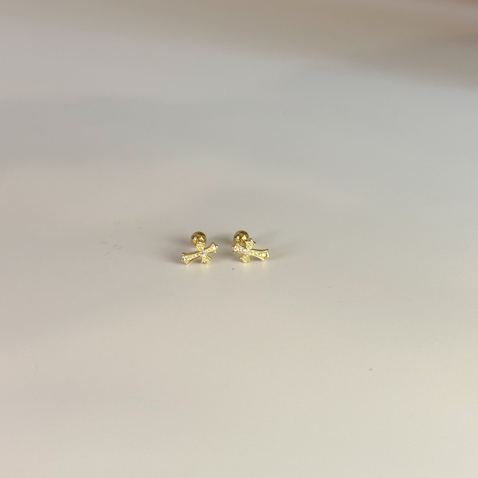 Aretes de broquel elaborados en plata 925 con un delicado baño de oro. Su diseño en forma de cruz combina elegancia y sutileza, perfectos para uso diario o para quienes buscan un toque simbólico y luminoso en su estilo. Ligeros, cómodos y con un acabado brillante que refleja la luz con cada movimiento.