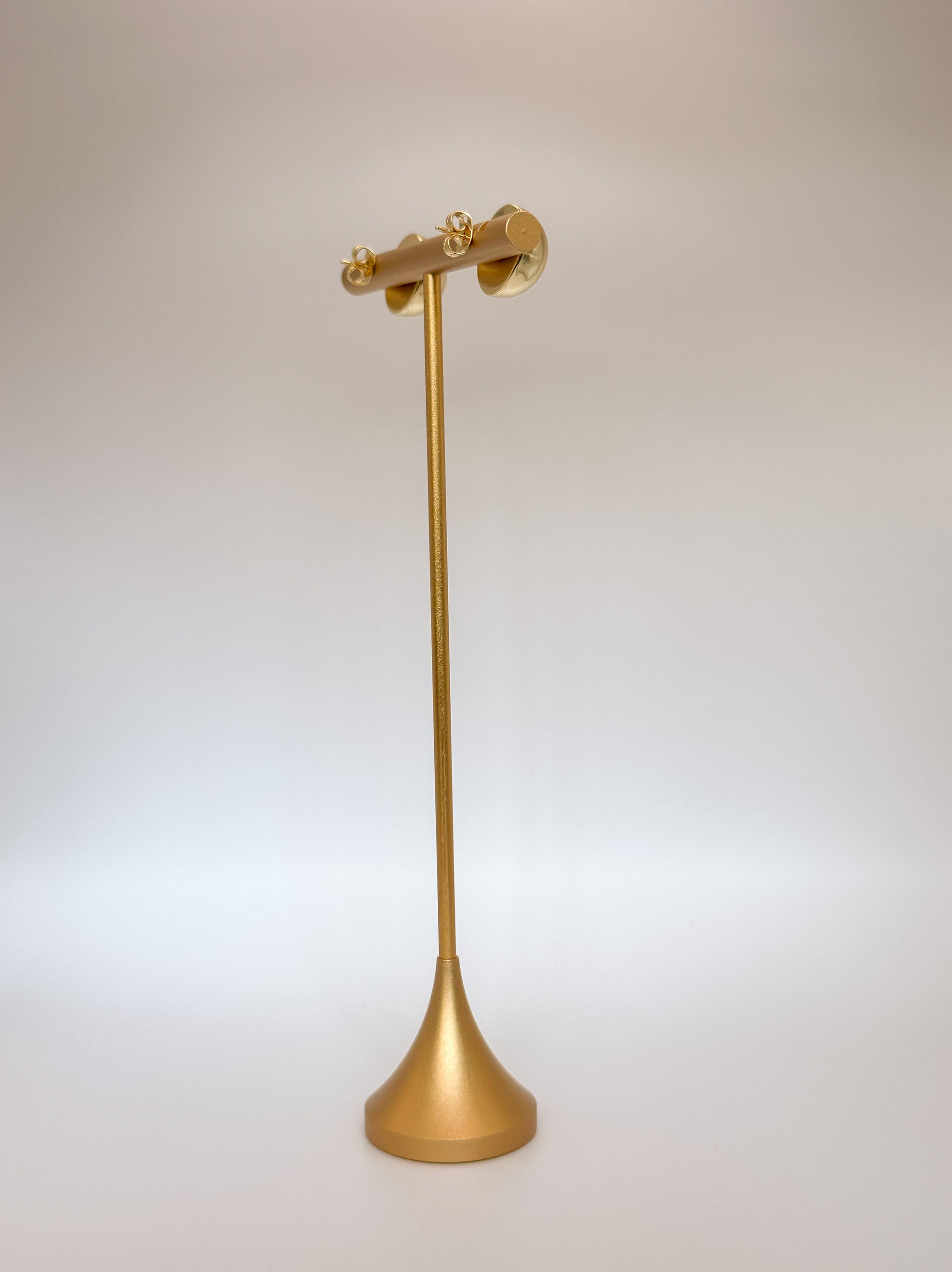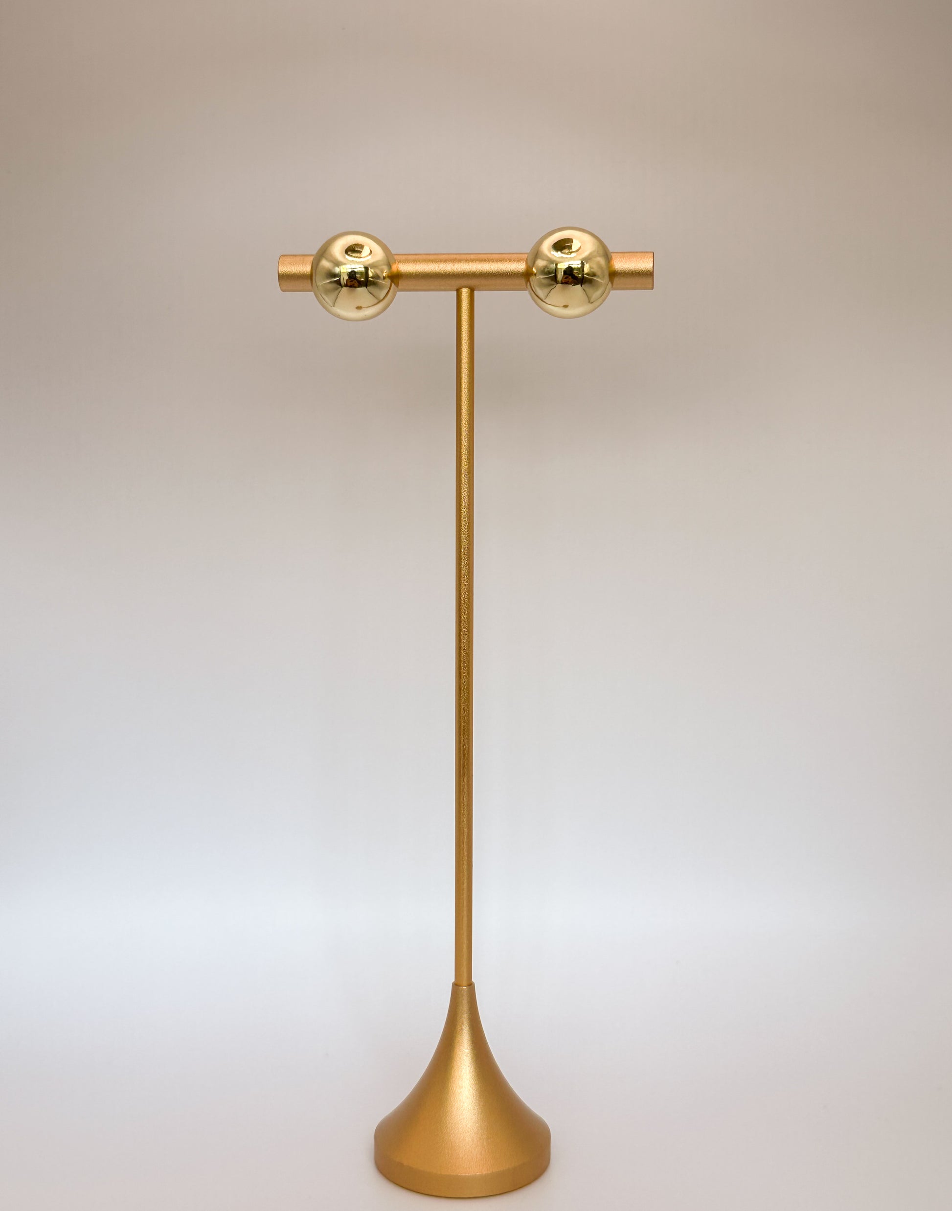 Aretes con forma de esfera que capturan la luz con un brillo suave y elegante. Su diseño minimalista los convierte en un accesorio esencial y atemporal, perfecto para elevar cualquier look con un toque de calidez dorada.