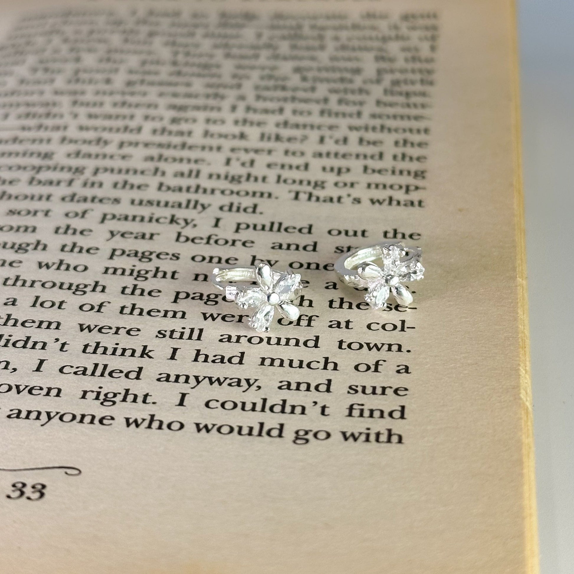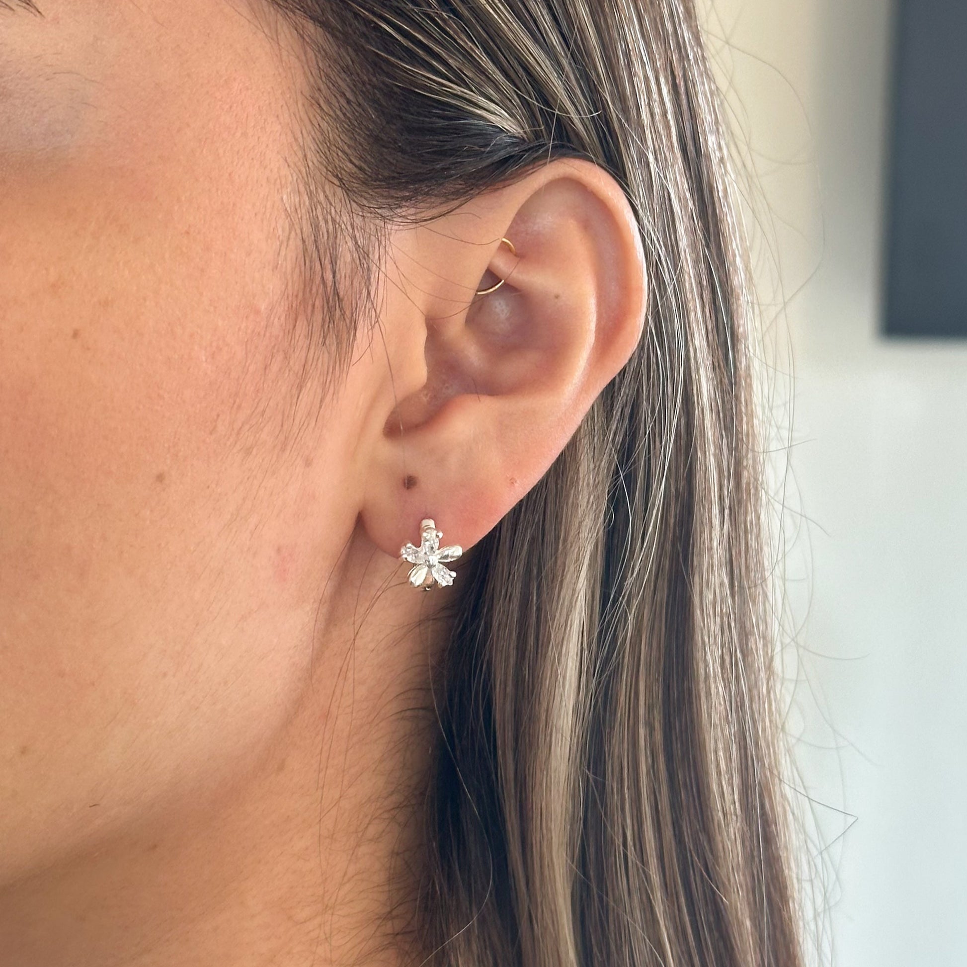 Argollas delicadas elaboradas en plata 925, adornadas con una flor de pétalos brillantes que reflejan la luz con cada movimiento. Su diseño femenino y atemporal las hace perfectas para quienes buscan un toque de elegancia sutil y natural. Ideales para uso diario o para complementar looks más formales.
