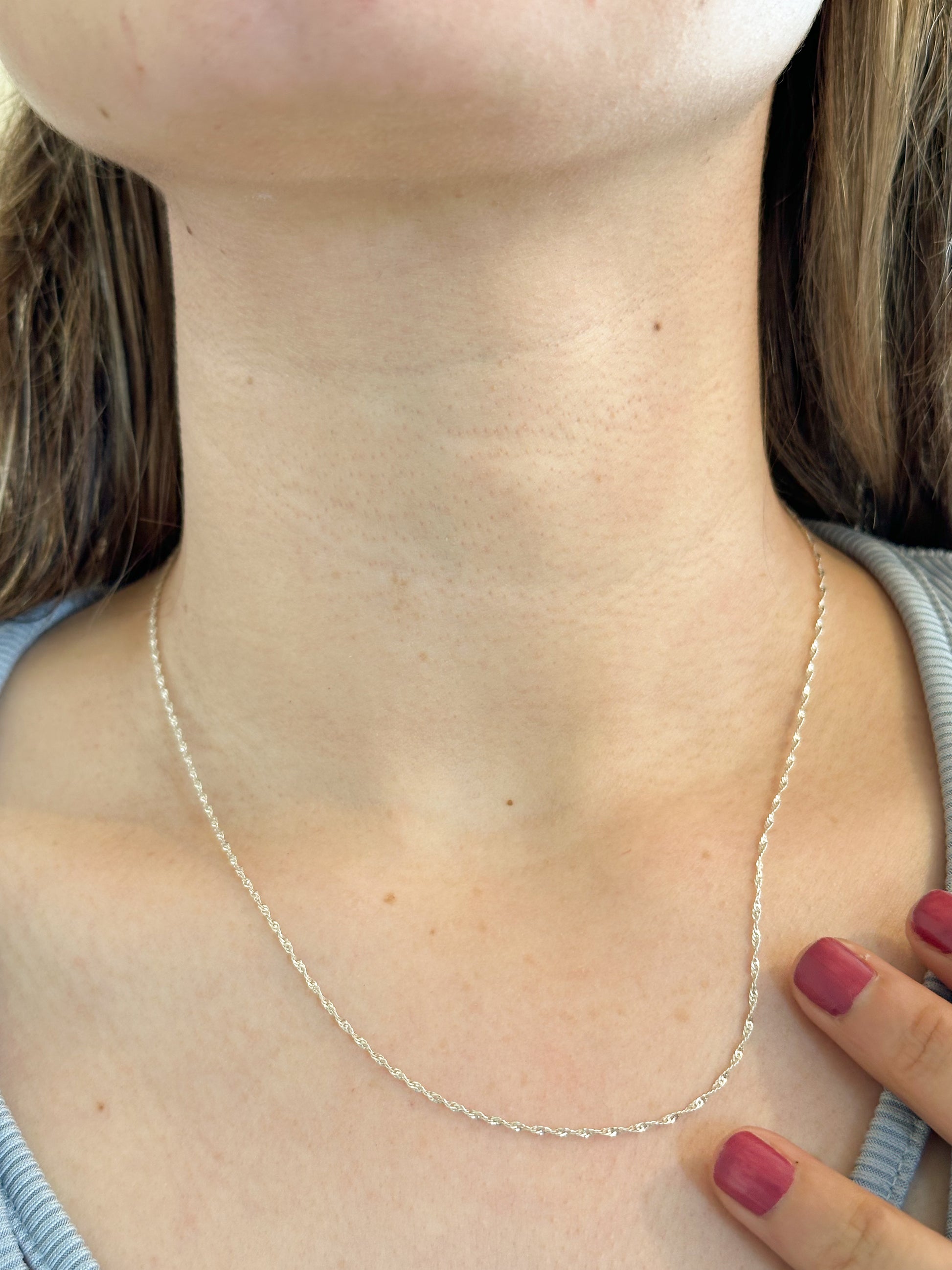 Un diseño clásico y versátil, con eslabones entrelazados que crean un efecto entorchado lleno de brillo y movimiento. Perfecto para usar solo como pieza protagonista o combinar con otros collares para un look layering elegante.