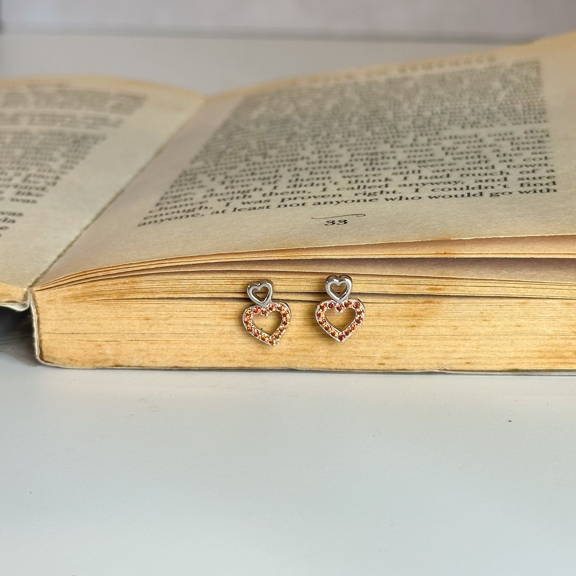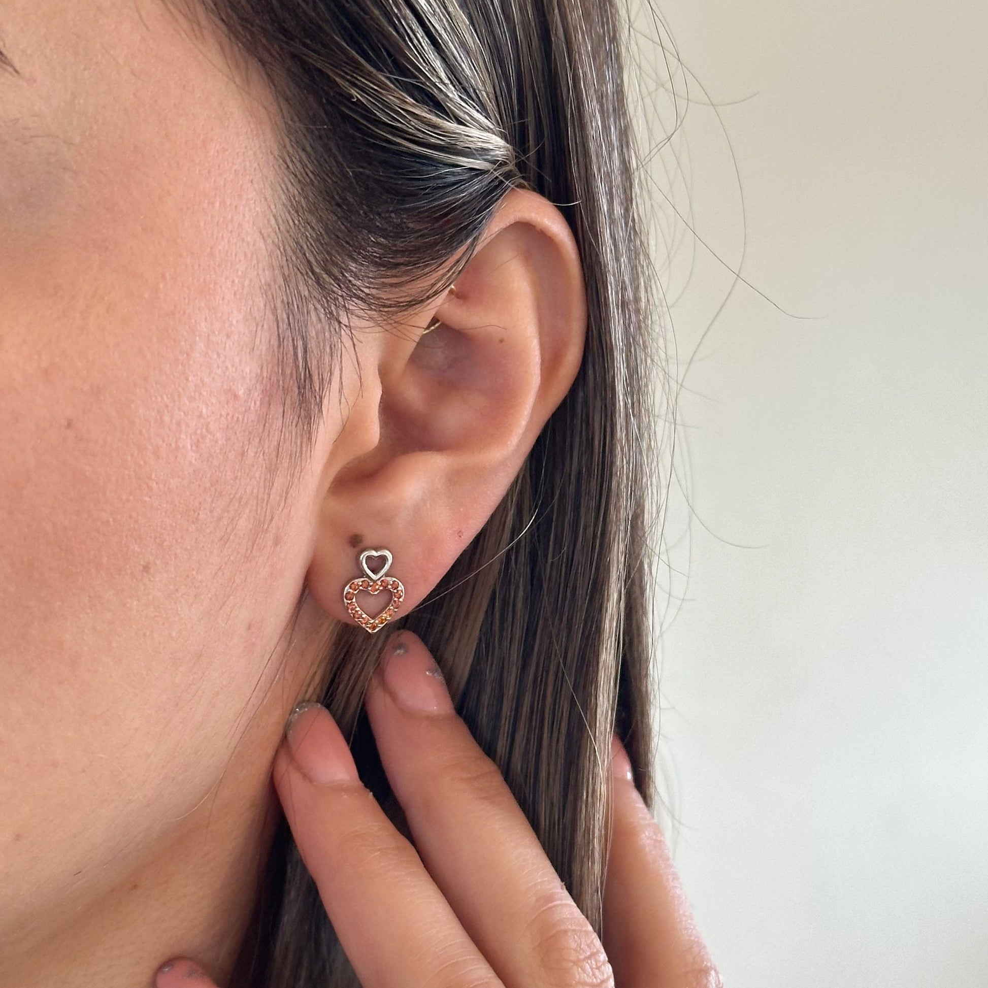 Los aretes destacan por su diseño delicado y encantador. Elaborados en plata 925, presentan un pequeño corazón superior que sostiene otro corazón con piedras en tonos cálidos, creando un brillo sutil y romántico.