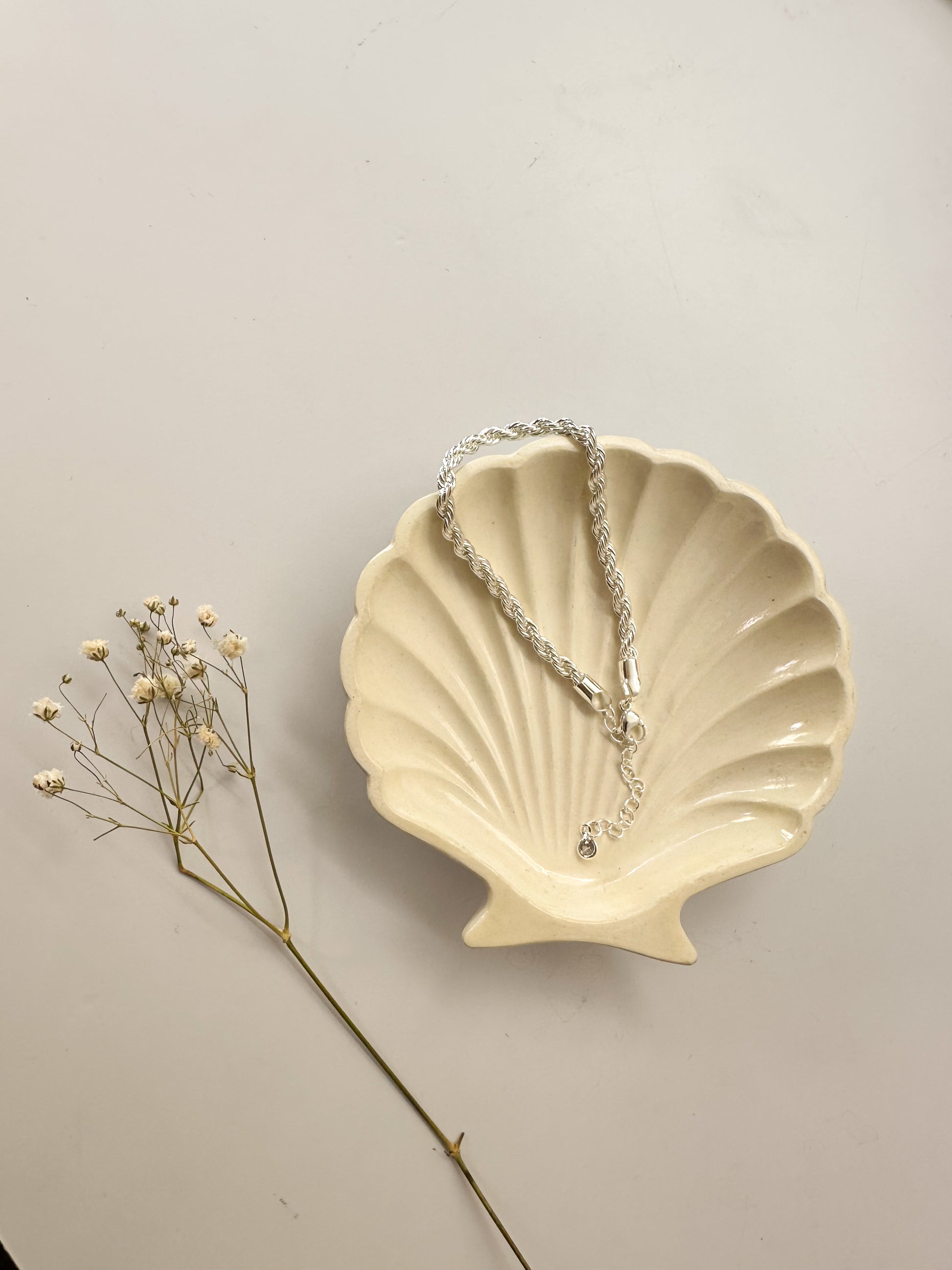 Una pulsera trenzada de brillo sutil que evoca la suavidad de las olas y el resplandor de la luz sobre el agua. Su diseño elegante pero relajado la convierte en un accesorio ideal para el día a día o para añadir un toque delicado a tus outfits más especiales.
