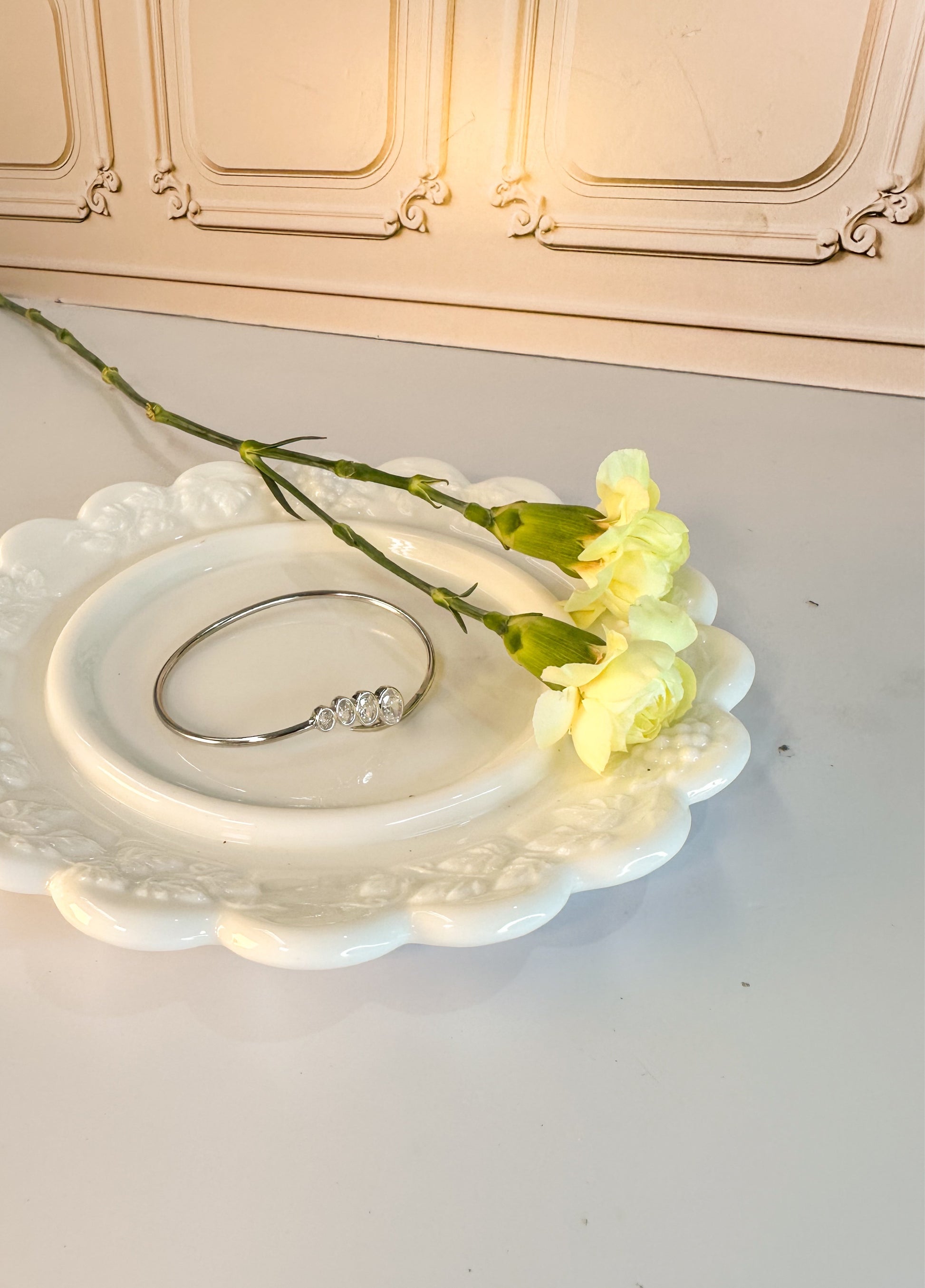 Pulsera rígida en plata 925 con cinco circonias en corte ovalado que evocan el brillo limpio de las primeras luces del día. Un diseño minimalista y femenino, perfecto para acompañarte con elegancia en cualquier estación del año.