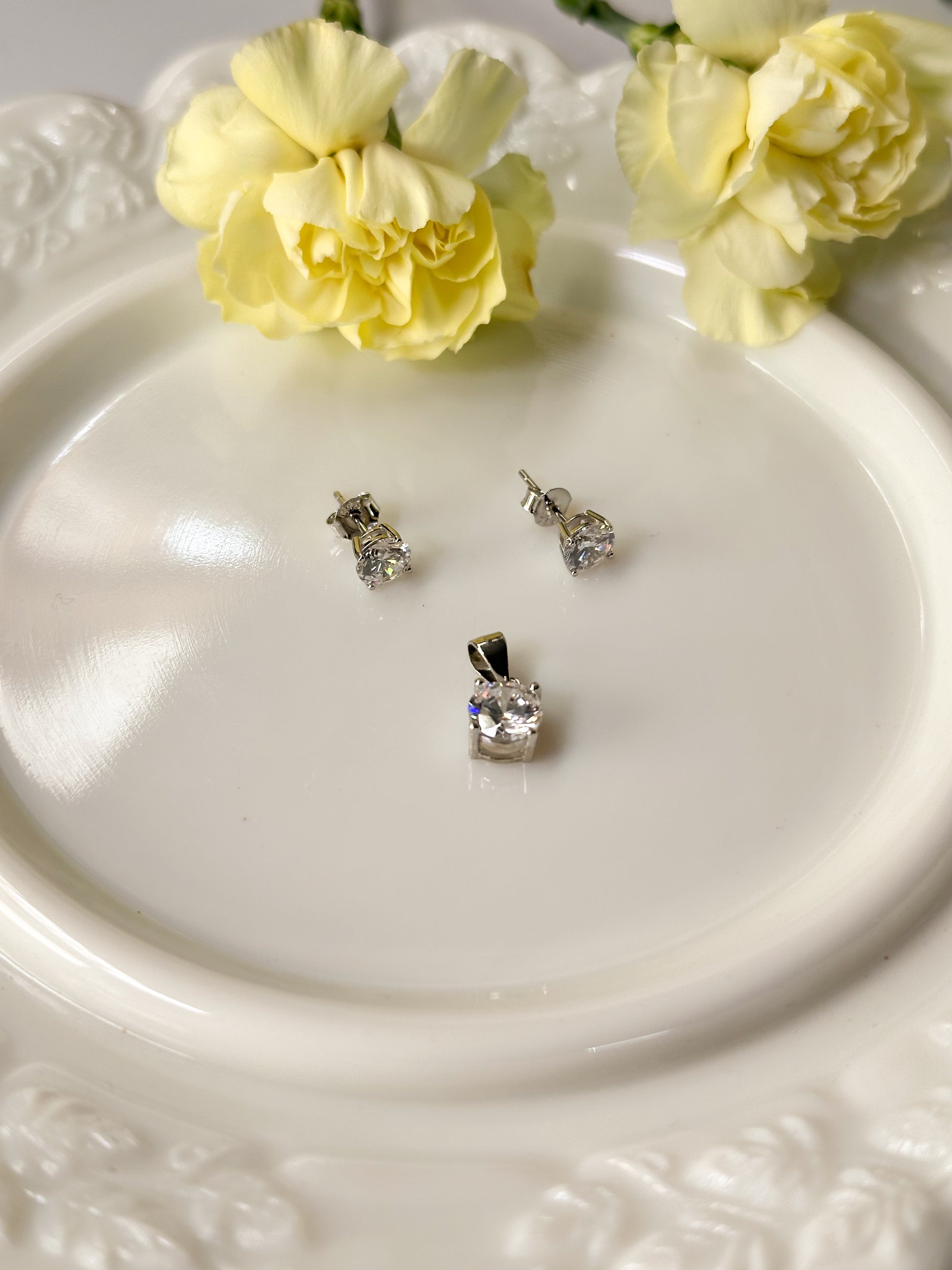 Set compuesto por aretes y dije, ambos con zirconias cúbicas de corte clásico. Un diseño limpio, luminoso y versátil que complementa cualquier estilo, desde el uso diario hasta una ocasión elegante.